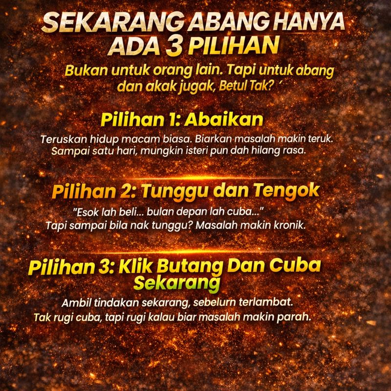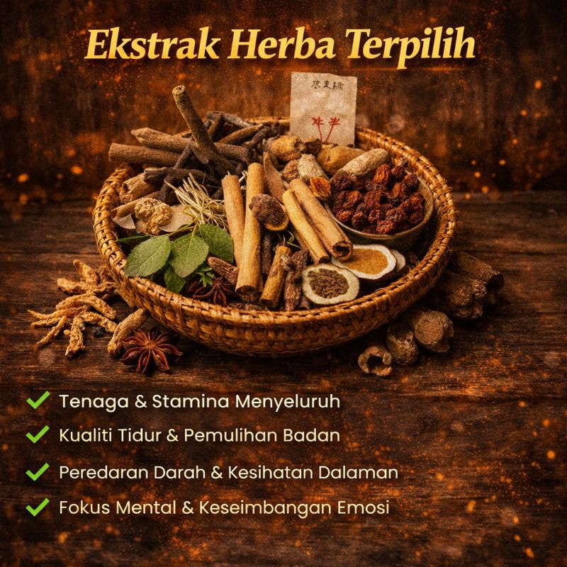 Produk ini BUKAN ubat-ubatan dan BUKAN bertujuan untuk merawat, menyembuhkan atau mencegah sebarang penyakit. Ia adalah MAKANAN TAMBAHAN yang dirumus daripada bahan herba semula jadi untuk sokongan tenaga dan kesihatan tubuh badan.