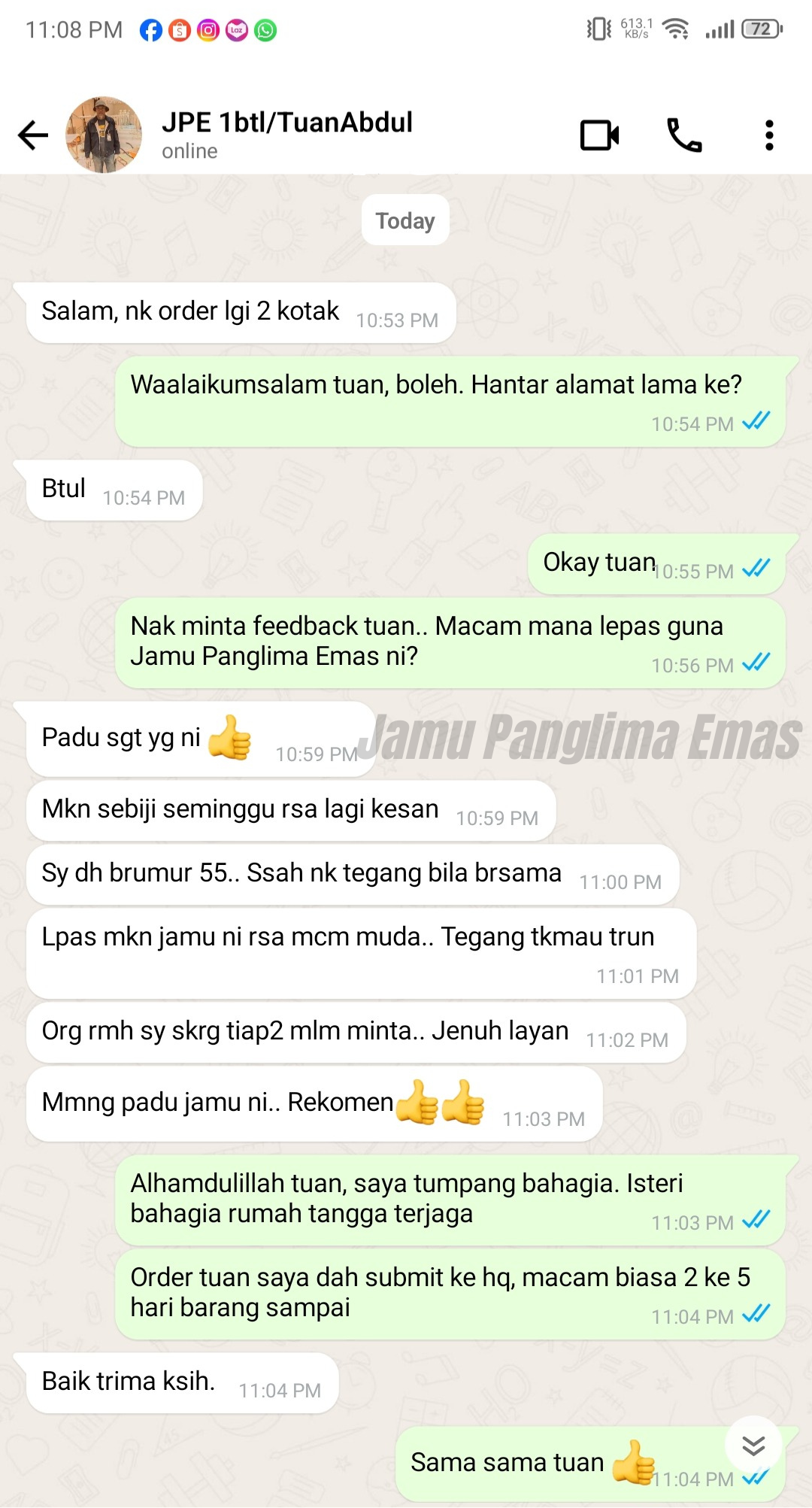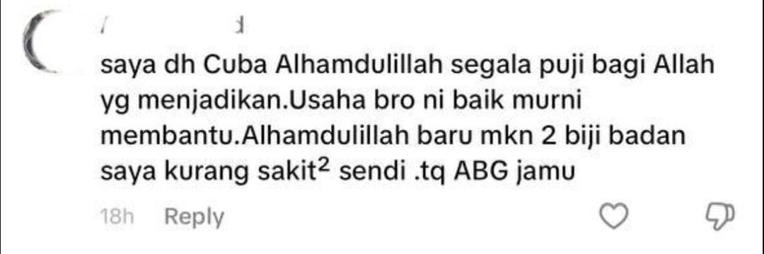 PENAFIAN: Keberkesanan produk ini bergantung kepada kesesuaian individu. Setiap hasil dari penggunaan adalah berbeza bagi setiap individu. Produk ini akan memberi kesan terbaik sekiranya pengguna mengamalkan dengan cara betul berdasarkan banyak testimoni yang diperolehi. Kita berikhtiar, tuhan yang menyembuhkan.